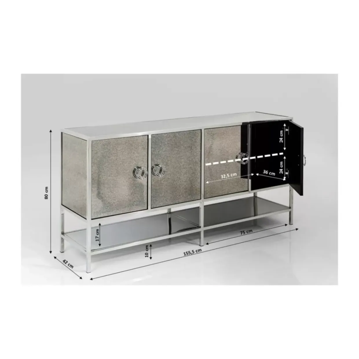 - Sideboard Mit Grau-Melierter Spiegelglas-Verkleidung Im Antik Look,Glasboden,Silber-Glanzendem Stahl-Gestell Sowie Zwei Boden Hinter Den Vier Turen